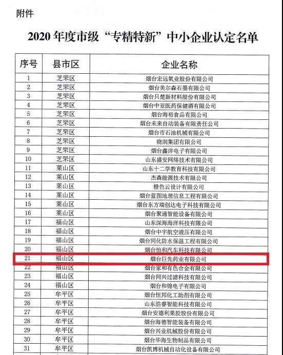 2020年10月14日,根據(jù)煙臺市工業(yè)和信息化局《關(guān)于組織申報(bào)煙臺市“專精特新”中小企業(yè)的通知》,經(jīng)縣市區(qū)推薦及專家評審,煙臺巨先藥業(yè)有公司繼2017年被評為市級“專精特新”中小企業(yè)后,再次獲得此項(xiàng)榮譽(yù)稱號。